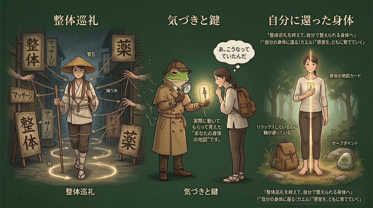 「整体巡礼を続けてきたあなたと、一緒に“痛みと身体の地図”を描きながら(体感型の評価セッション)、自分自身で整えられる身体を手に入れていく場所——それが、身体ミステリー研究所 Tree FROG です。」