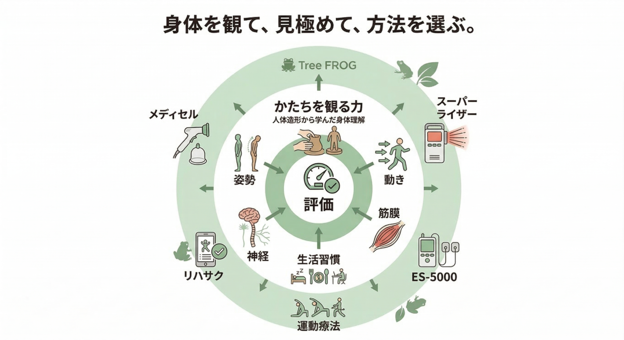 ■ 通院回数や期間について Tree FROGでは、画一的なプランではなく、お一人おひとりの「どうなりたいか」という目標や、お身体の心理社会的な背景を大切にしています。 そのため、実際に初回でお身体を拝見し、詳しくお話を伺うまでは、必要な通院回数をお伝えすることはしておりません。 「納得してから始めてほしい」ので、初回に最適なプランを一緒に考えていきましょう。