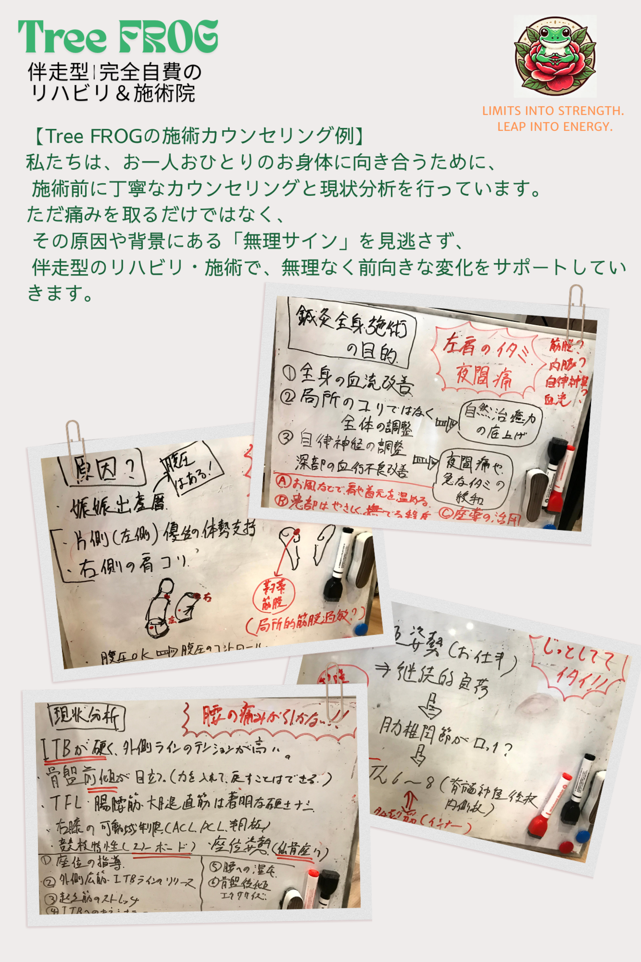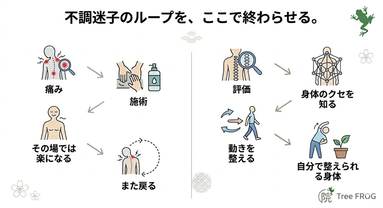 Tree FROGは、そこから抜けるための“気づき”と“身体の地図”を、一緒につくる場所です。